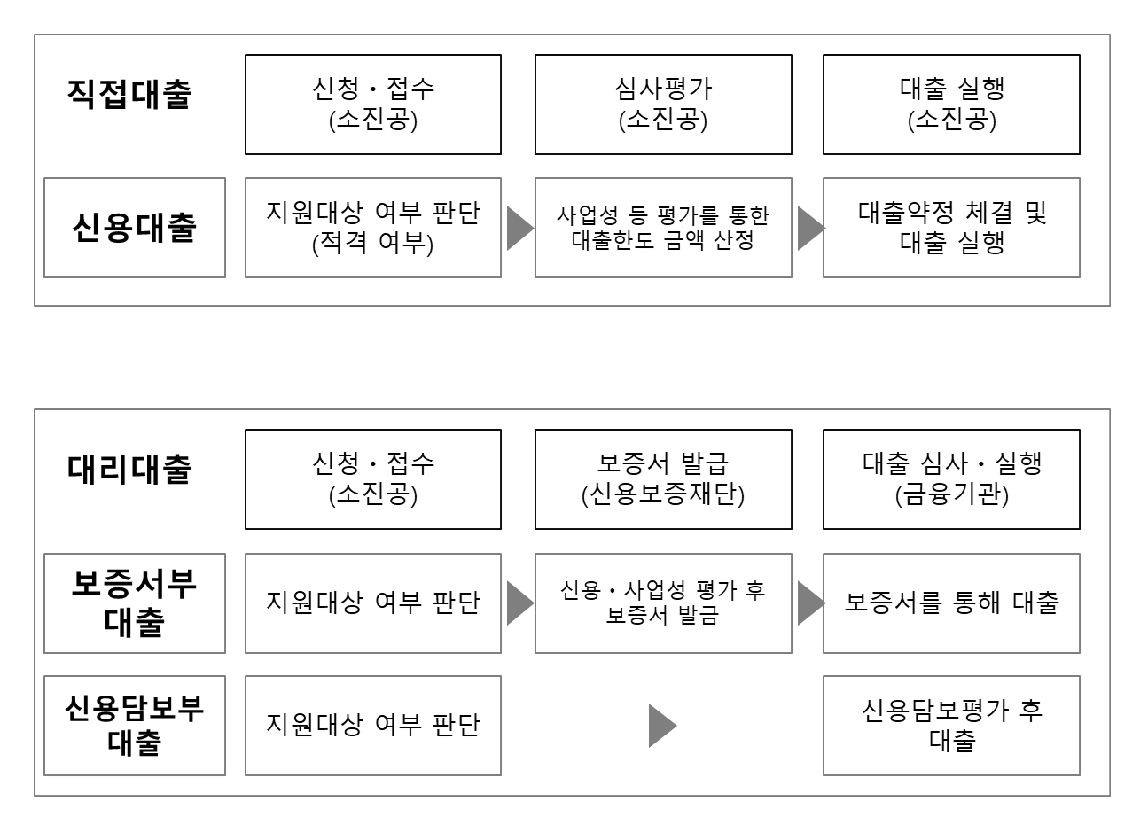 • 대리대출 : 소진공에서 정책자금 지원대상 확인 후, 금융기관에서 보증서부(싱용보증기관), 신용 또는 담보부대출 실행